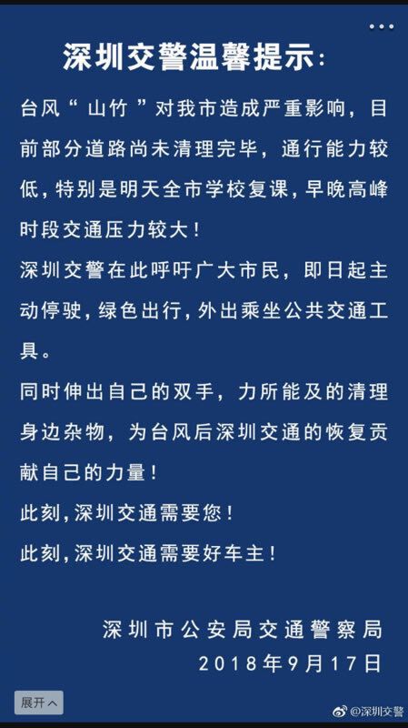 深圳市部分道路仍存在因台风天气被刮到的树木妨碍正常的道路交通,9月18日是台风过后的复学日,预计早高峰期间将有大量车流涌上路面,进一步加剧道路的拥堵,形势仍为严峻。