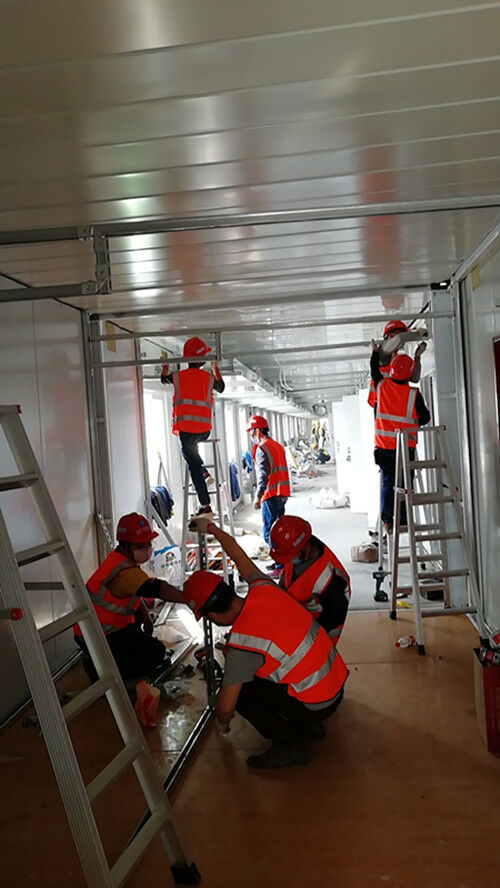 接下来,便是争分夺秒、日夜不停,24小时的紧急抢建。面对工期短、资源紧缺、疫情防控工作严峻等诸多挑战,美芝股份施工项目部围绕工程目标任务制定了周密的工作计划,并结合现场实际情况不断优化工作方案,将工期安排精确到每小时,合理有效配置人员和物资,充分发挥其效用最大化。为加快工程进度,在确保质量的前提下,项目团队采取“两班倒”工作机制,实行24小时不间断施工,经过19天的奋战,项目部团队按照要求完成了工程二区一、二层的走道支架安装、电缆桥架安装、风管安装、电缆敷设等工作任务。