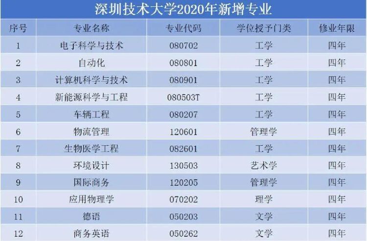 据悉,据教育部2019年本科专业备案和审批结果,深技大在2019年机械设计制造及其自动化、物联网工程、光源与照明、交通运输、汽车服务工程、工业设计等6个专业的基础上,2020年将新增12个专业,届时招生专业将达18个。学校相关负责人表示,深技大今年招生省份也将在2019年的基础上进一步增加,在广东省外的招生省份预计超过10个,具体情况待确定后,将第一时间于深技大官微及招生办公众号等平台发布。