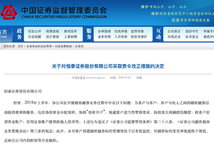 为此,中国证监会决定对恒泰证券采取责令改正的行政监管措施,要求该公司对上述问题予以整改,于3个月内向内蒙古证监局提交整改报告;对违规行为负有责任的刘全胜、余安义、陈褘杰、陈建功等人,要进行内部经济问责,并向内蒙古证监局书面报告结果。