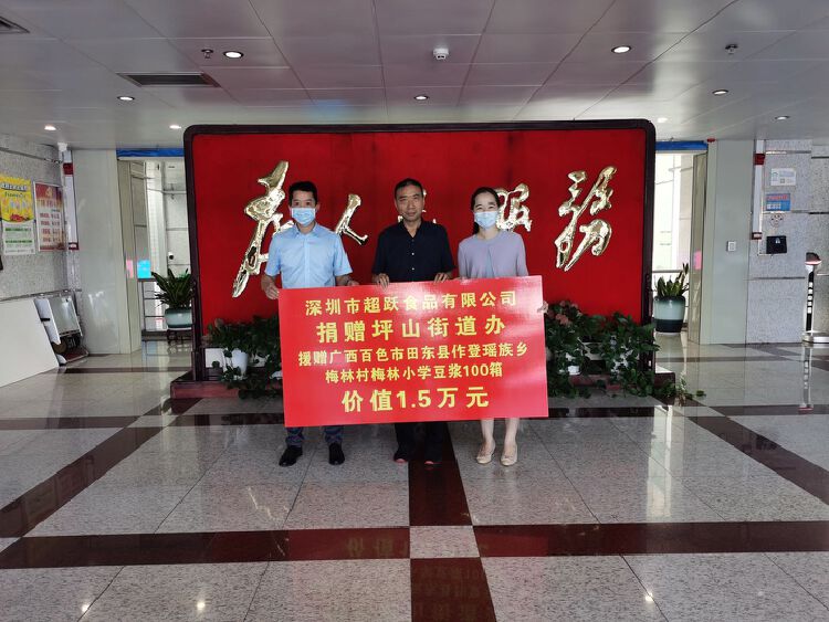 一场直播,一次公益,一群人的购物狂欢,一个个具有社会责任感的企业,深圳市同安玩具有限公司、深圳市坪山新区童梦世界工艺品厂、深圳市乐中行科技有限公司这些坪山辖区企业捐赠直播现场互动赠品,深圳市达科为生物工程有限公司向陆河、田东捐赠5000份核酸检测采样管和采样拭子,价值10万元整。深圳市超跃食品有限公司捐赠豆浆100箱,每箱150元,价值15000元,海洛斯净水科技有限公司捐20台,价值4万元。