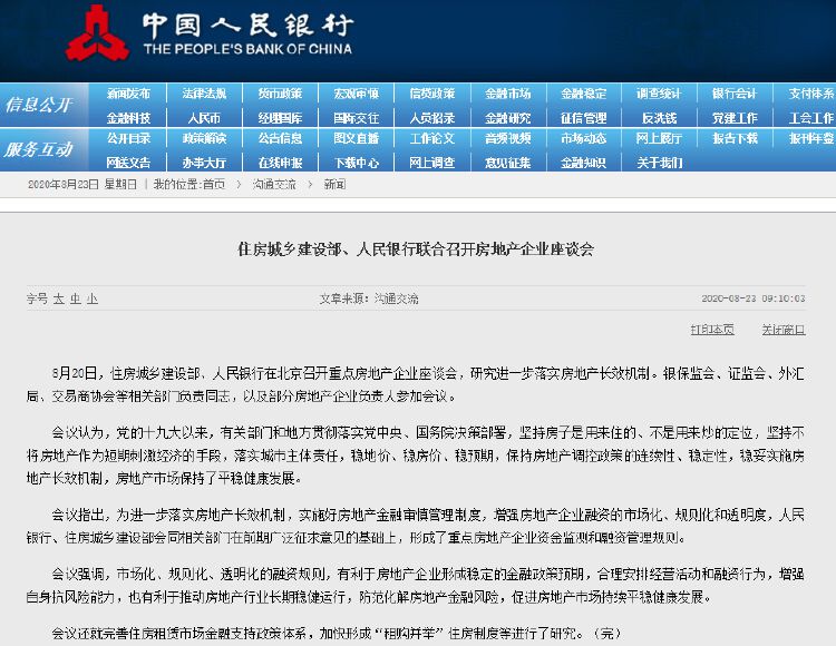 8月20日,住建部、央行在京召开了重点房地产企业座谈会。会议指出,央行、住建部会同相关部门在前期广泛征求意见的基础上,形成了重点房地产企业资金监测和融资管理规则。