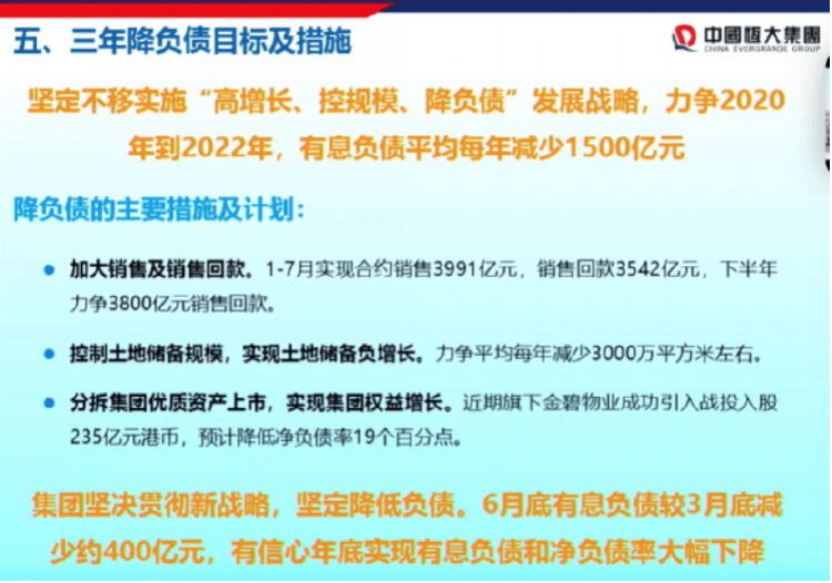 夏海钧表示,下半年恒大将继续以最大决心和力度降低负债:一方面,加大销售和销售回款,今年内部销售目标是8000亿元;另一方面,严格控制土地储备规模,力争平均每年减少3000万平方米,“土地储备每年负增长,可以节约一定资金。”