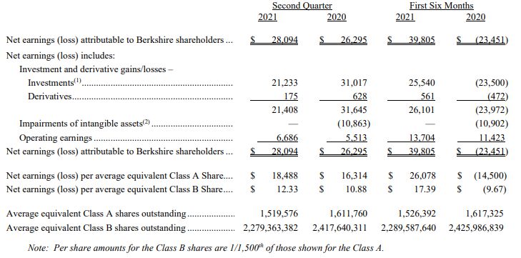 伯克希尔·哈撒韦A类股每股收益18488美元,上年同期为16314美元;B类股每股收益12.33美元,上年同期为10.88美元。