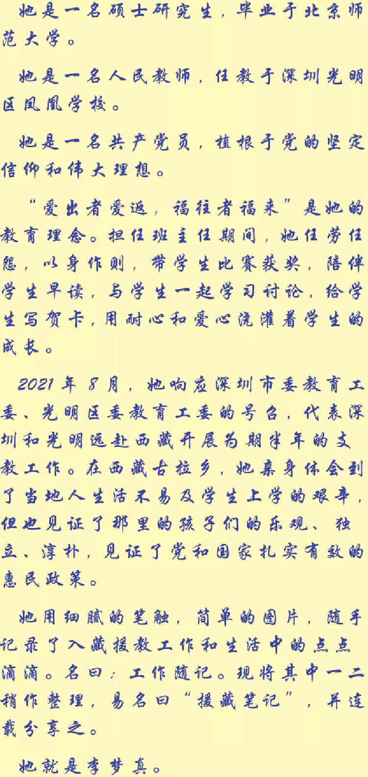 我现在教五年级的语文、音乐和三年级的科学、美术,在备课方面取得了凤凰学校黄玉玲老师的支持和帮助,相信还有更多同事们愿意为我提供援助。我现在仍在逐步了解这里的学情和教学风格。我也正在思考还可以为这两所学校做点什么。一方面,在教研上我们是否能实现沟通。另一方面,学生之间是否可以建立沟通。深圳学生的眼界和善良,这里孩子的淳朴与艰苦,如果能达成很好的沟通对双方都是受益良多的事情。