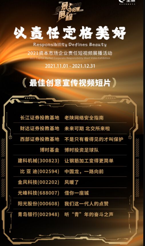 据悉,2021年,全景网以“以责任定格美好,以热爱书写奋斗”为主题再次举办“景show前程”——资本市场企业责任短视频公益展播活动,历时2个月,旨在透过企业的视角,看到一个坚守责任、坚定信念的中国资本市场,看到中国企业阔步向前的一个个动人瞬间。来自A股、港股、美股、新三板等市场各类型企业2000余个短视频参评六大奖项,其中“最佳创意宣传视频短片”表彰具有新颖性、创造性的短视频作品。