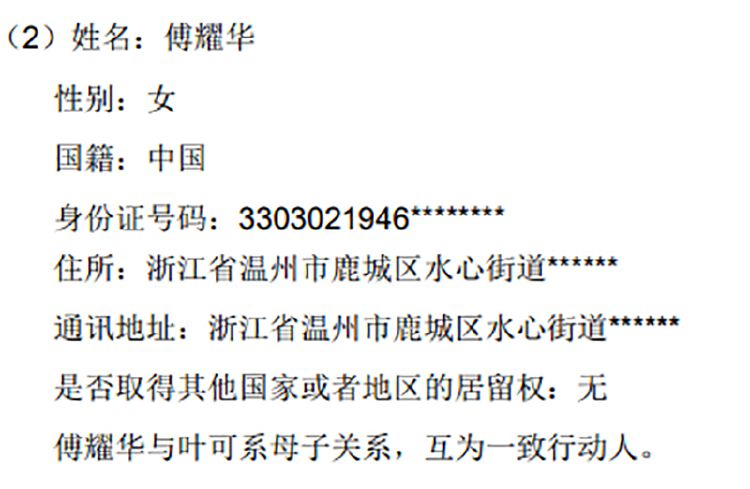 资料显示,傅耀华目前的住所和通讯地址均为浙江省温州市,今年77岁。叶可目前居住在上海市浦东新区,系西藏岩山投资管理有限公司的执行董事兼总经理、岩山投资管理(上海)有限公司的执行董事、上海道准科技有限公司的执行董事。