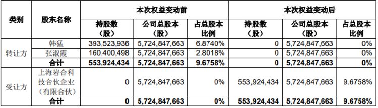 二三四五于1月8日晚间公告称,公司持股5%以上股东韩猛及张淑霞与上海岩合于2023年1月6日签署了《股份转让协议》,上海岩合将受让韩猛及张淑霞通过协议转让方式转让的公司无限售条件流通股5.54亿股,占公司目前总股本9.68%,转让价款合计为20亿元,折合3.61元/股。