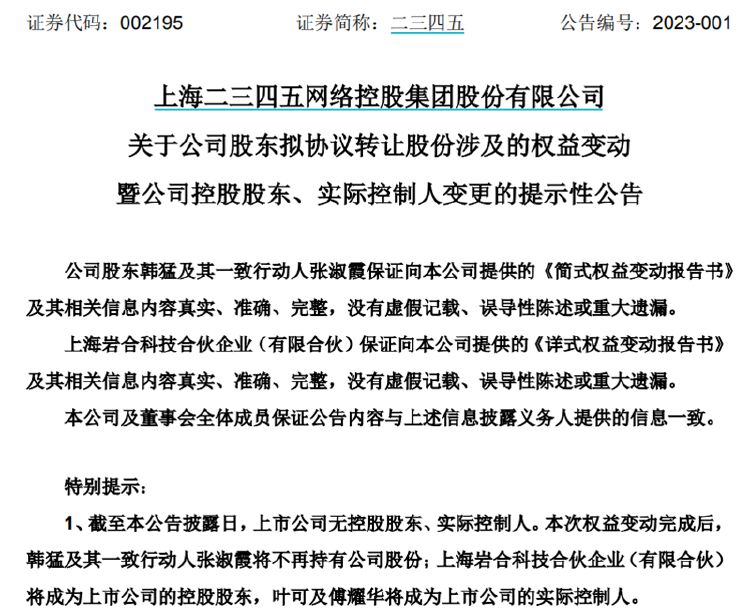 目前,二三四五处于无控股股东、实际控制人的状态。如本次权益变动完成后,韩猛及其一致行动人张淑霞将不再持有公司股份。上海岩合将成为公司的控股股东,傅耀华及叶可将成为上市公司的实际控制人。