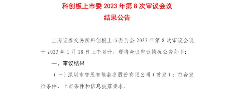 深圳或再添一家科创板上市公司!科创板上市委1月18日最新公告显示,深圳市誉辰智能装备股份有限公司(以下简称“誉辰智能”)首发:符合发行条件、上市条件和信息披露要求。这意味着,这家位于深圳宝安区沙井街道、主营收入主要来源于锂离子电池制造装备的公司再过一关,后续等证监会同意其IPO注册后,誉辰智能登陆科创板将梦想成真!