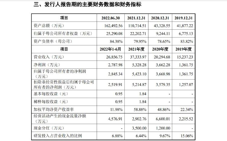 财务数据方面,招股书显示,2019年-2021年及2022年上半年,誉辰智能的营业收入分别为1.5亿元、2亿元、3.7亿元及2.7亿元;净利润分别为1,361.75万元、3,662.28万元、5,328.28万元及2,787.98万元。
