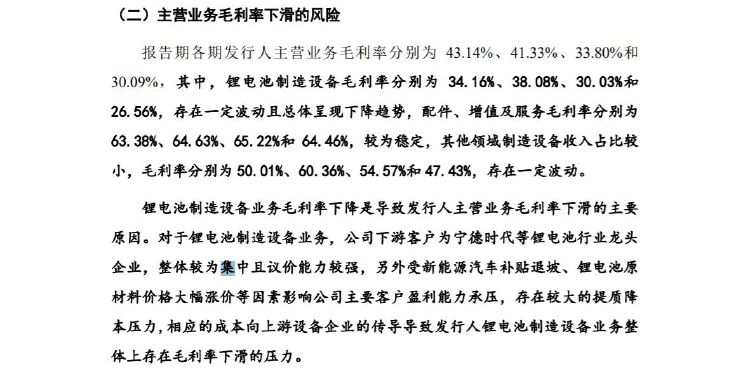 招股书解释说,锂电池制造设备业务毛利率下降,是导致发行人主营业务毛利率下滑的主要原因。对于锂电池制造设备业务,公司下游客户为宁德时代等锂电池行业龙头企业,整体较为集中且议价能力较强,另外受新能源汽车补贴退坡、锂电池原材料价格大幅涨价等因素影响公司主要客户盈利能力承压,存在较大的提质降本压力,相应的成本向上游设备企业的传导,导致公司锂电池制造设备业务整体上存在毛利率下滑的压力。