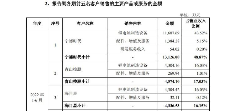 公司已掌握锂电池电芯装配和电芯检测环节的大部分设备制造技术,产品覆盖了动力锂电池的电芯装配、电芯检测等生产环节,具备拓展其他锂电池客户的能力。报告期内,公司对宁德时代销售收入占总收入的比重已逐步下降至48.87%,除宁德时代外,公司与中创新航、瑞浦能源、亿纬锂能、欣旺达、塔菲尔、蜂巢能源、海基新能源等客户建立了良好的合作关系。