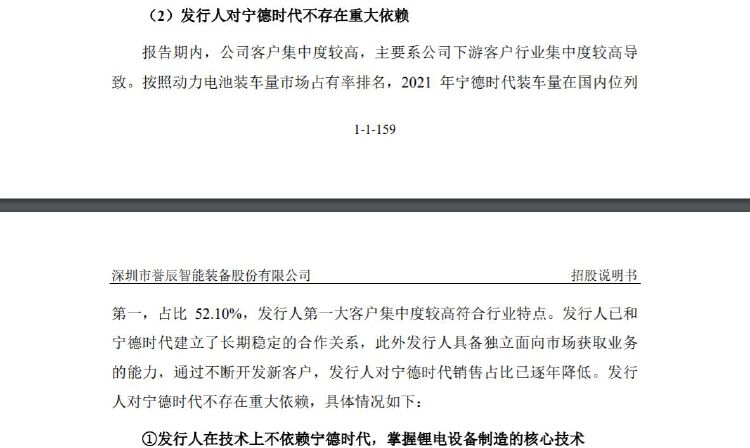 但在招股书中,誉辰智能也表示,公司具备独立面向市场获取业务的能力,通过不断开发新客户,公司对宁德时代销售占比已逐年降低。公司对宁德时代不存在重大依赖。具体情况如下: