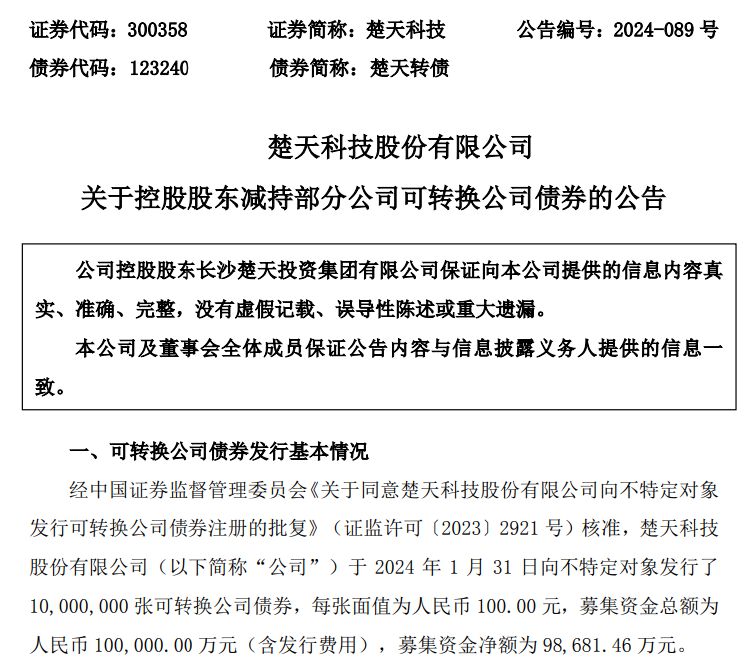 公告显示,楚天科技于2024年10月9日收到控股股东楚天投资告知,其近期通过大宗交易方式合计减持其持有的“楚天转债”135万张,截至2024年10月9日其减持数量占公司发行可转换公司债券总量的13.5%。