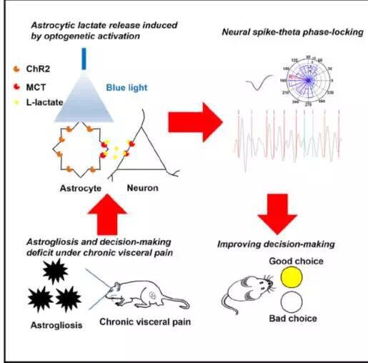 (慢性痛大鼠的胶质细胞被干预后释放乳酸,影响周围神经网络电活动的同步性,从而改善慢性痛大鼠的决策能力,图片来源:深圳先进院)