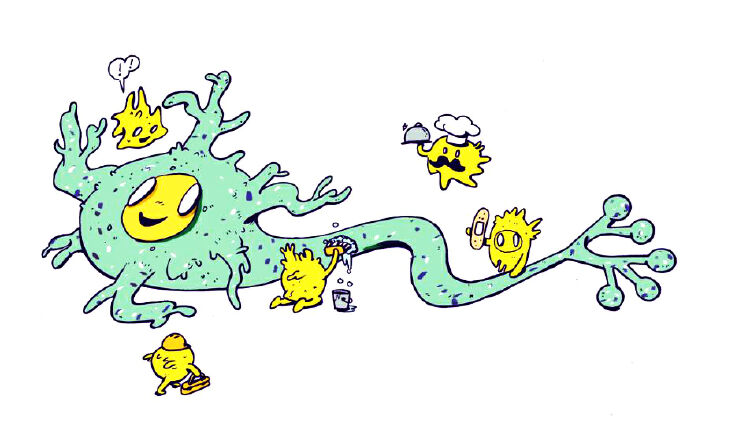 屠洁研究员把胶质细胞比喻为“管家”――“它做的事很杂。它提供营养,给你做饭;你睡觉了,它就出来清理垃圾;你生病了,它给你释放一点营养物质。”胶质细胞虽然是一位打杂员工,却操着店长的心啊。