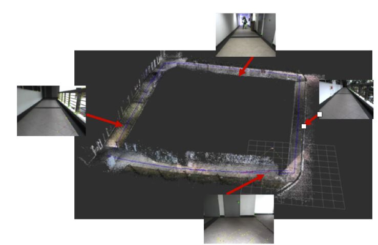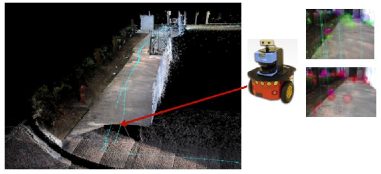 (机器人通过摄像头对环境识别并在云端的地图上匹配出自己在陌生环境的位置。图片来源:中科院深圳先进院数字所云计算中心)