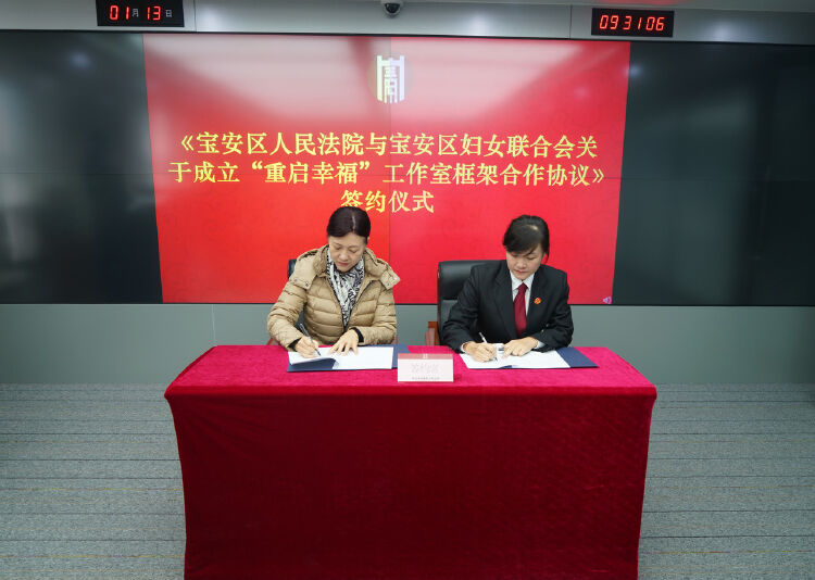 1月13日上午,深圳市宝安区法院与宝安区妇女联合会在该院签订《深圳市宝安区人民法院与深圳市宝安区妇女联合会关于成立“重启幸福”工作室框架合作协议》。
