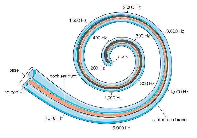 △ 耳蜗底部对高频声音敏感,尾部对低频声音敏感。(图源:视觉中国)