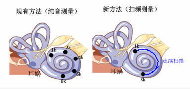 而扫频耳声发射检测能够给受试者连续播放不同频率的声音刺激,通过新的算法,精确检测任意频率的听力损失情况,分辨率极高。
