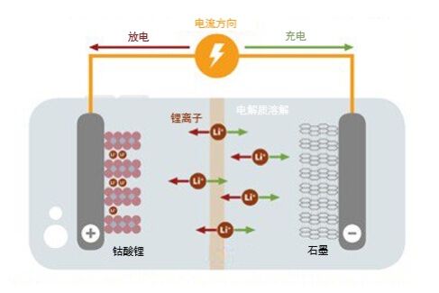 现在最常用的锂离子电池,正极材料一般是钴酸锂等活性物质,负极一般用石墨等。充电时,锂离子(Li+)从正极移动到负极,放电时,锂离子从负极移动到正极。