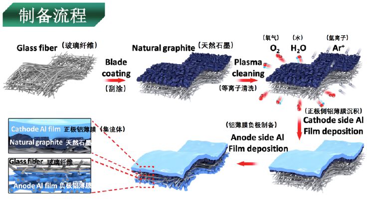 这种柔性快充电池,制作工艺居然一点都不繁琐:将天然石墨“涂”在玻璃纤维表面(电池正极),接着通过等离子体工艺去除石墨中的水和氧气,保持它的纯净;然后,用物理气相沉积工艺,将铝箔膜直接沉积在石墨表面(正极集流体);再用同样的技术,在玻璃纤维的另一面沉积铝箔膜负极。