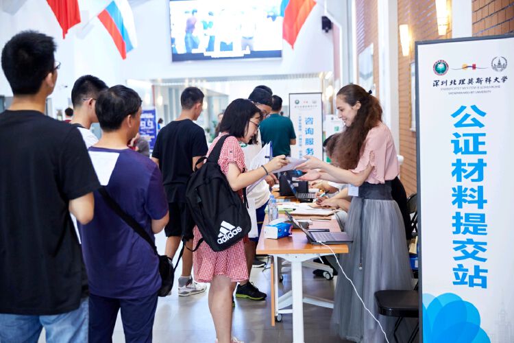 8月4日当天,深北莫校园里彩旗飘扬,氢气球、欢迎标语将校园点缀得绚丽多彩,充满喜庆氛围。教学楼随处可见的中俄两国国旗以及设计精美的中、俄、英三种语言海报,凸显学校的国际化特色。为了给2018级新生和家长提供良好的服务和环境,学校设置了资格查验接待站、缴费服务站、“绿色通道”接待站、新生亲友休息区等接待站,极大方便了学生办理入学手续。早上6时30分,第一辆迎接新生的巴士就从校园驶往深圳北站和深圳机场;而校内各岗位的工作人员8点前已经全部到位,随时准备迎接新生的到来。正在过暑假的25名2017级学生来到学校当志愿者,承担着新生接机接站、现场咨询指引以及协助办理入学手续等工作。有的同学是前一天刚从莫斯科夏令营返回学校即投入到志愿者服务中。