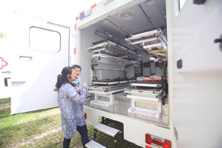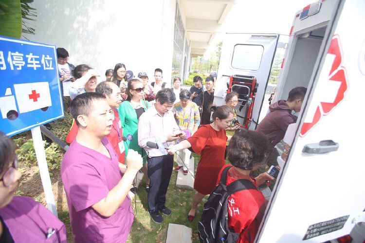 活动首站就是位于光明区中山大学附属第七医院。在中山七院的大院里,三辆带着方形车柜的大皮卡吸引了众人的注意,块头比一般救护车还要大,车轮比普通车轮大一圈。“这是救护车吗?”有参观群众询问。