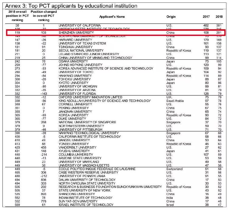 深圳大学共有PCT申请数量228件,PCT专利申请公开数量201件,位列全球教育机构第3位,中国高校第1位。
