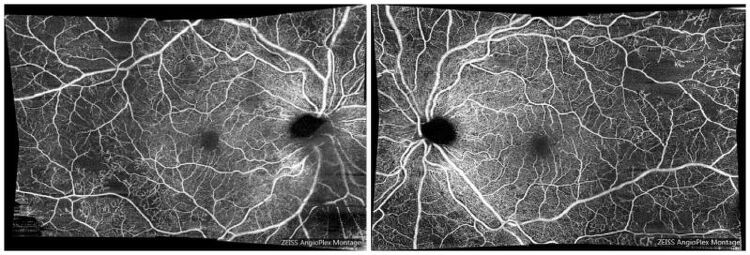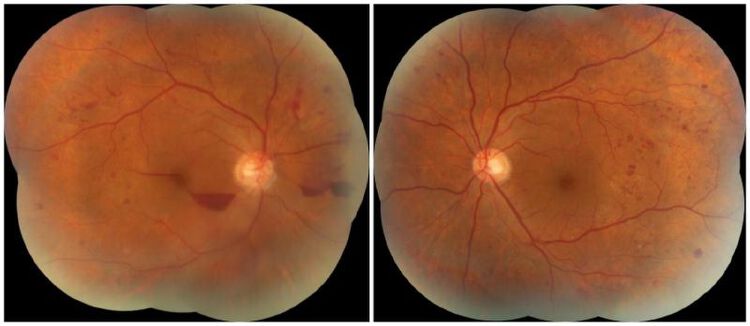 “患者68岁,一边视力0.04,一边才0.01,几乎看不到了。”中山七院眼科主任彭鸿钧介绍,患者刘先生(化名)有高血压,结果两个眼底都出血,出血吸收以后就形成了一个硬性的斑,视网膜坏掉了,黄斑也大量出现,视力严重受损。