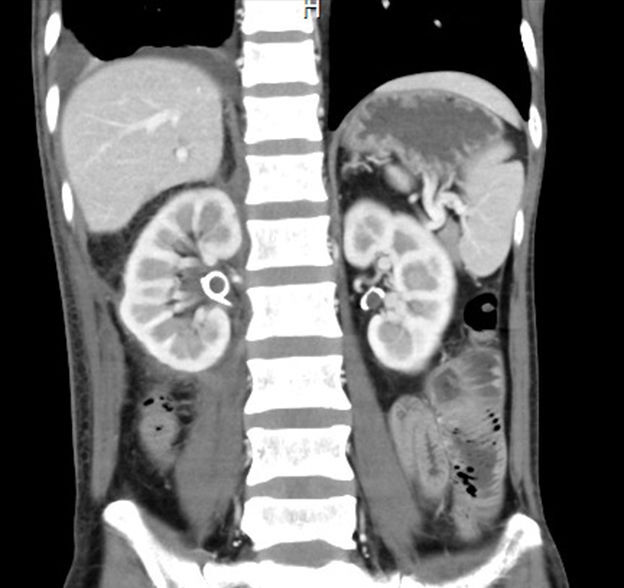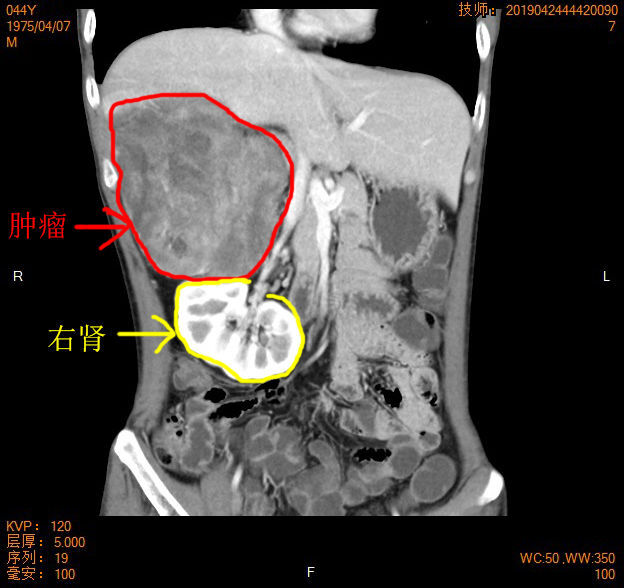 ▲4月份CT检查发现巨大肿物,右肾受挤压