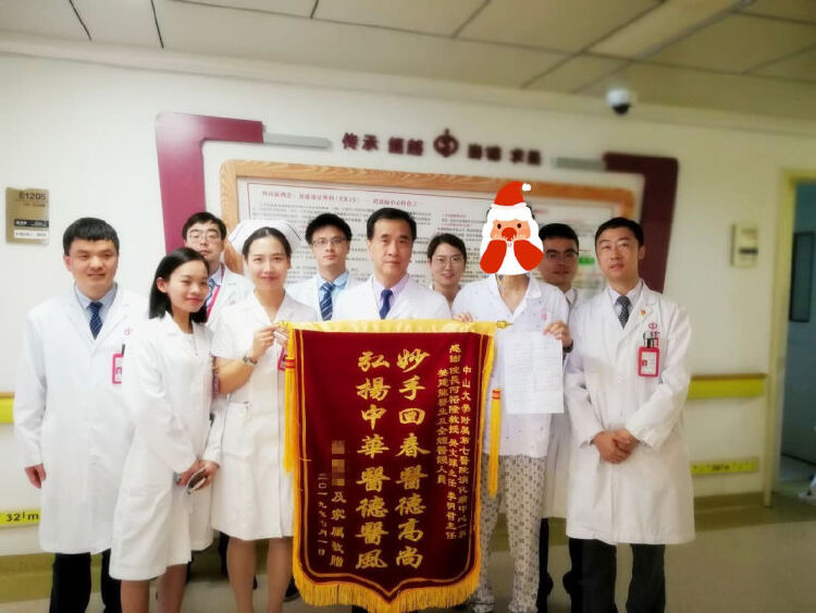 术后,经过短暂的ICU监护和近1个月治疗恢复,林先生能够正常饮食,身体各项指标恢复正常,下肢感觉、运动功能未受到任何影响,出院复查CT显示右肾回到正常生理位置,肿物彻底切除干净,康复出院。出院前,林先生向何裕隆教授团队送来了锦旗,并再三感谢!