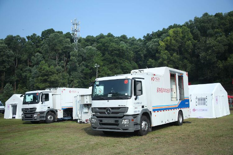 移动医院拥有的现代化急救、手术装备和特检设备,能够对急危重伤病员进行抗休克、心肺复苏、除颤、通气等紧急救命处理,能够开展一定程度的急救手术、专科手术,大大提高紧急救治的能力和效率,最大限度地降低伤残率和死亡率。目前,移动医院已配置9辆紧急医学救援车,包括野战急救车、中型伤员运输车、中风移动急救救护车、野战手术车等;同时配置了9顶移动医院主帐篷,具有抗沙尘、抵风力、抗降水、抗腐蚀等特性。在野外无水电补给的情况下,“移动医院”能够维持72小时正常运转,具备自我保障、长期作战能力。当有重大的灾难事件发生时,中山七院移动医院分队可以快速抵达灾难现场,现场搭建起一家临时医院,届时可同时开展2台手术,昼夜24小时通过量不低于100名伤患。
