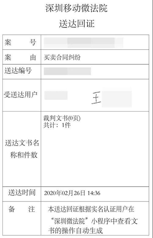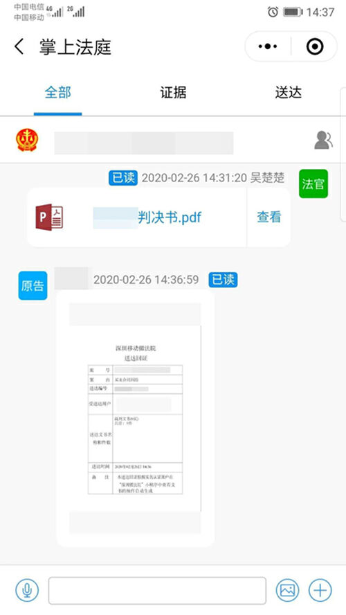 2月26日下午2时31分,在深圳宝安法院民事速裁庭的办公室里,法官吴楚楚登录深圳移动微法院,将一份判决书的电子版本上传到系统。随后,她电话联系该案的原告王先生,告知其判决书已经上传系统,待其查收。几分钟后,吴楚楚从系统上查阅到,原告王先生已经点击查看该份判决书,系统也已经自动生成电子送达回证。至此,深圳基层法院首例以电子方式送达的判决书,完成全部送达流程。