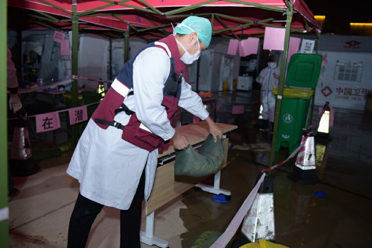 ▲雨夜医护人员与后勤人员不分你我一起动手堆沙袋
