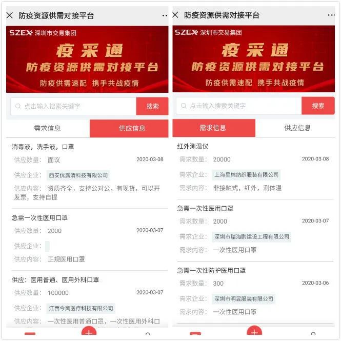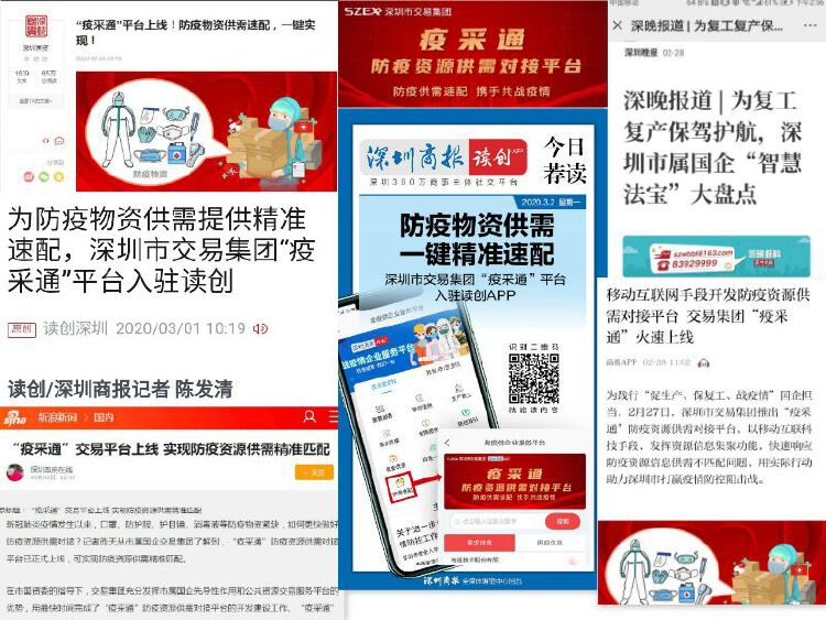 为更好解决当前新冠肺炎疫情防疫物资紧缺的情况,2月27日,深圳市交易集团研发并免费推出“疫采通”——防疫资源供需对接平台上线,并同时入驻深圳商报读创APP平台。“疫采通”充分发挥市属国企上下游生态圈资源协同优势,推动全社会信息广泛共享,实现线上无缝衔接、线下精准对接、高效达成合作。