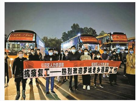 对规模用工开展安全排查,为就业用工保畅通。2月21日,福田区与广西河池市罗城仫佬族自治县积极对接,帮助108名建档立卡务工人员赴深返工。 福田区通过复工返程包车等方式提供“点对点、一站式”直达运输服务,做好防疫监测,提升工人返岗率,满足企业用工需求。