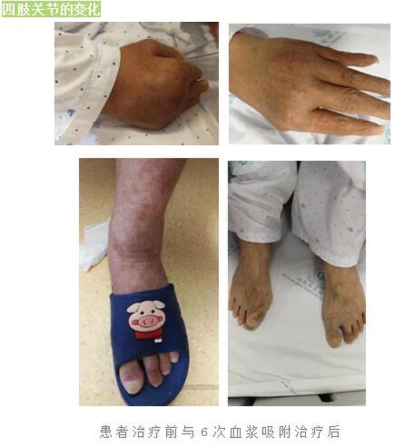 张先生在经过6次血浆吸附治疗后,由原来高热不退,四肢关节疼痛难忍,步行艰辛,需由车床送至血液透析室,到体温逐渐恢复正常,四肢关节肿胀疼痛明显得到缓解,能自由外出散步。