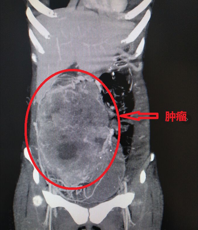 ▲CT检查见肿物占据半个腹腔存在侵犯大血管可能