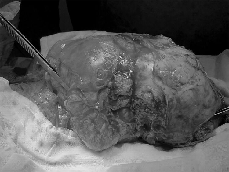 ▲被切除的肿瘤体积为28×24×24cm