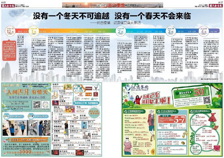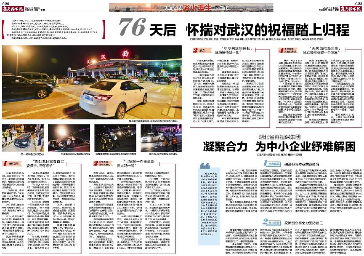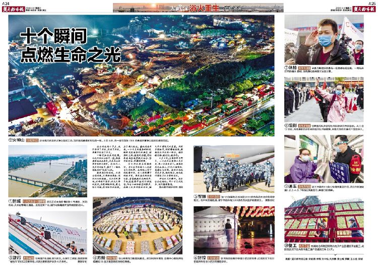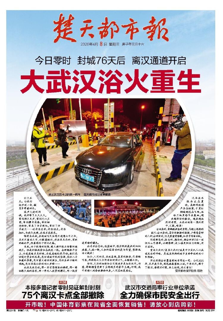 4月8日,在封城76天后离汉通道打开之际,在武汉重启之日,楚天都市报围绕“浴火重生”,用64个版面,回顾了疫情期间全国人民对武汉、对湖北的大爱之情。