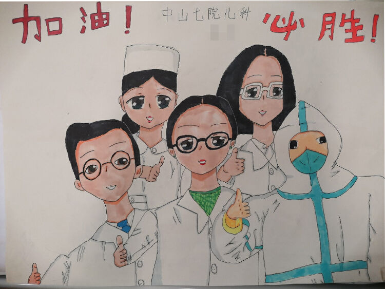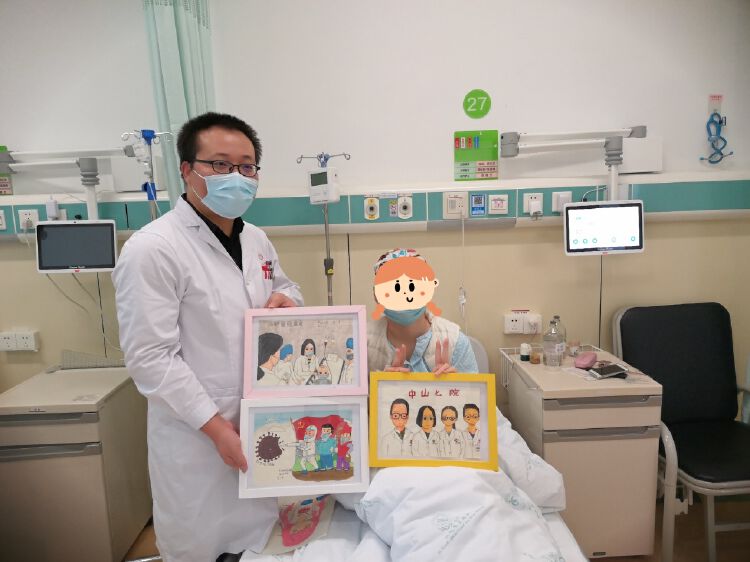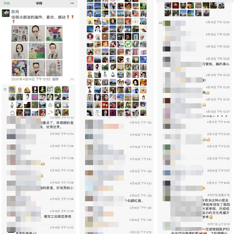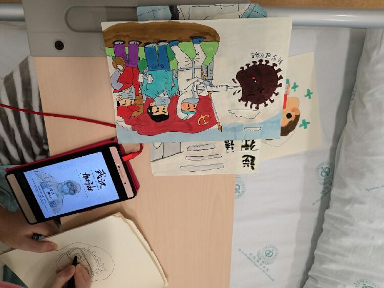 儿科的医护人员看到苹果的画作既惊叹又感动,惊叹的是苹果的画作水平,每个人物特点鲜明独特,感动的是几乎每幅画作上都写的是:中山七院,五(三)班,苹果已经把七院当成她的第二个学校了。陈纯副院长和刘艾娇护士长忍不住拿出手机拍照发了朋友圈,于是就有了下面的一幕。
