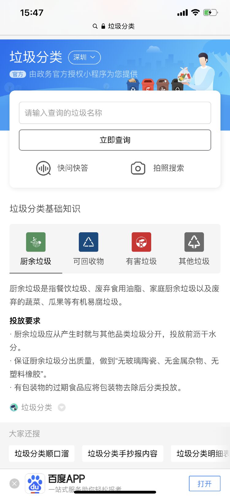 市民可通过文字、语音、拍照搜索等全场景使用垃圾分类功能,及时获取深圳市关于垃圾分类的相关政策和垃圾分类指导。如果无法确定垃圾具体属于哪个类别,还可以通过小程序下方的“语音”和“拍照”功能,用语音搜索或者视觉搜索来快速识别垃圾类别。