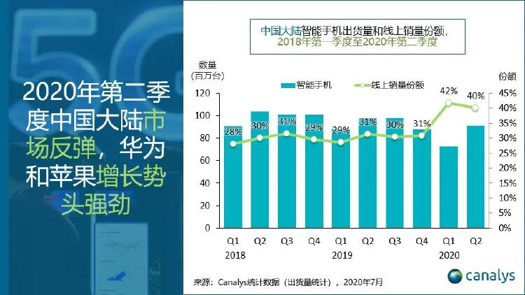 由于经济活动明显回暖,中国智能手机市场正逐步复苏。7月31日,第三方调研机构Canalys发布第二季度中国智能手机市场报告称,该季度出货量逾9000万台,尽管较2019年同期收缩7%相比,但环比增长率仍达到25%。其中,华为出货量最高,市场份额44%。
