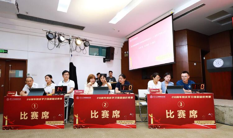 “学习强国”知识竞赛活动分为前期预热和现场比赛两个阶段。在近一个月的前期预热中,各教职工党支部积极动员党员、入党积极分子登录“学习强国”APP学习。现场比赛分为必答题淘汰赛和抢答题决胜赛两个环节,竞赛题目涵盖“四史”、习近平总书记重要讲话、党建知识、清华校史等内容。