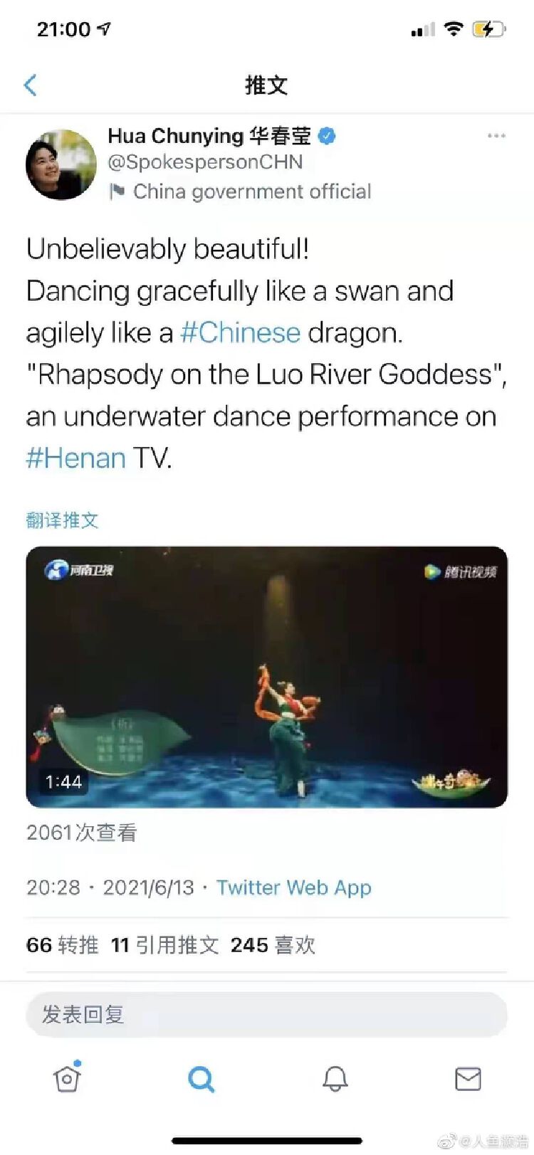 6月12日晚在河南卫视首播后,迅速通过网络媒体火遍全网,不仅人民日报、新华社纷纷转发。6月13日晚,外交部新闻司司长华春莹在个人推特账户上也点赞: