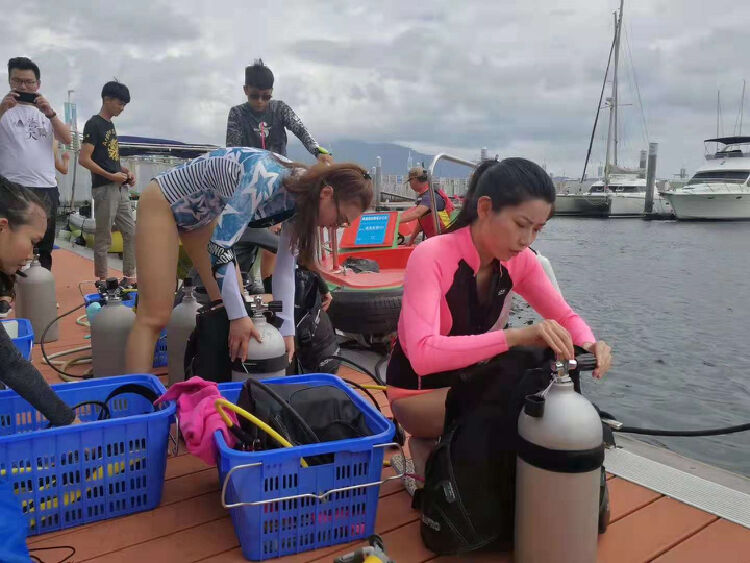2018年7月9日,何灏浩(前一)正在准备潜水装备(深圳商报/读创记者 李博拍摄)