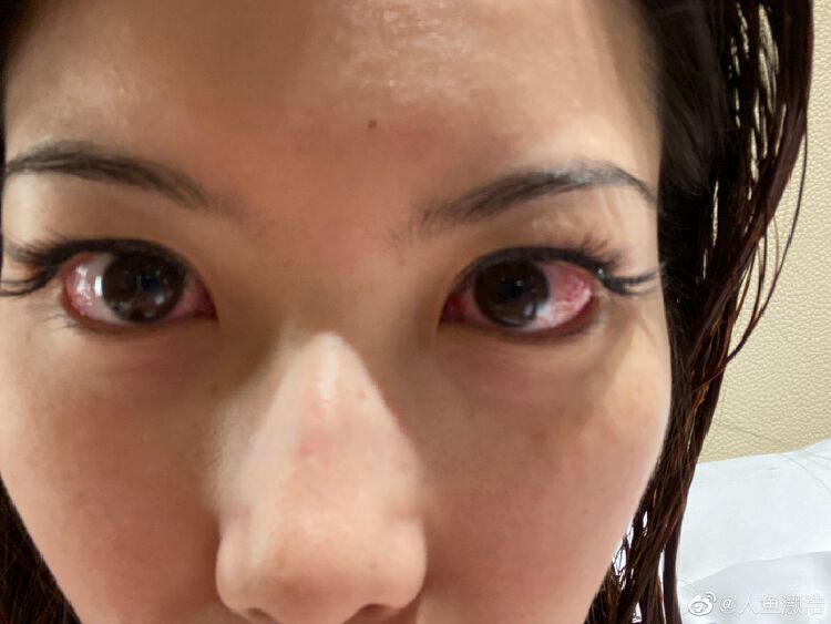 何灏浩在微博”人鱼灏浩”上发的自己的眼睛充血的照片