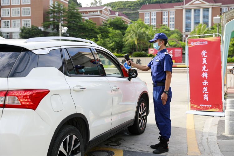 近期,走进深职院留仙洞校区正大门,就能看到穿着崭新蓝色制服的安保人员精神饱满地伫立在岗位上,身旁树立着鲜红标牌——“党员先锋示范岗”。岗位队员熟练地为入校人员测温验码、快速放行,遇到有疑问的来访人员,耐心解释,准确指引,严格落实学校疫情防控和安全管理措施,高标准、高质量完成早、晚入校高峰时期的安全检查和人流、车辆疏导。